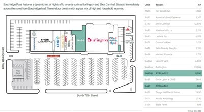 Southridge Plaza features a dynamic mix of high traffic tenants such as Bed Bath & Beyond and Shoe Carnival. Situated immediately across the street from Southridge Mall.