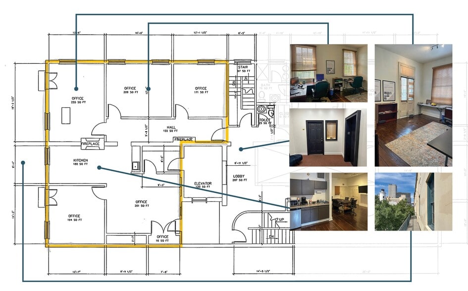 Located at the corner of Julia and Camp streets, this second-floor office suite combines modern convenience with historic charm. The space features both private offices and open work areas, along with a small kitchenette for added functionality.