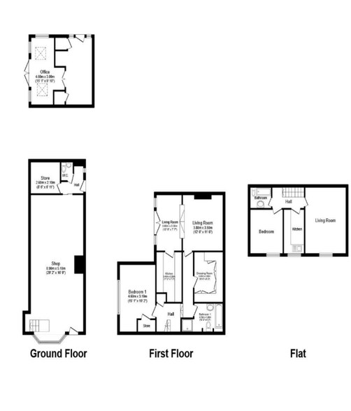 Ground floor commercial unit with self contained 1 bed flat above and 2 bed residential property to the rear.