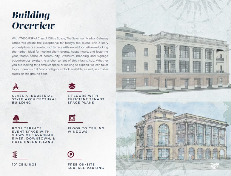 Savannah Harbor provides a new smart Savannah in a secure, walkable urban environment with great access to the national landmark district. Located on Hutchinson Island, this Class A, 3-Story, Office Building has access to unrivaled waterfront views and direct access to The Westin Savannah Harbor Golf Resort & Spa and Savannah Convention Center (SCC). Master plan also envisions future residential, restaurants, shopping, and various retail and hotels. Whether you take the ferry or drive, The Savannah Harbor Gateway Office is built for today’s top talent and connects them to an immediate sense of community + lifestyle.