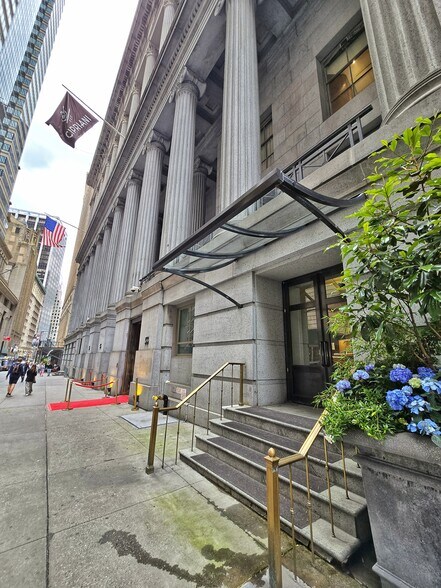 55 Wall Street is an 9 stories tall, historic building with granite facade includes two stacked colonnades facing Wall Street, each with twelve columns in the heart of Financial District.