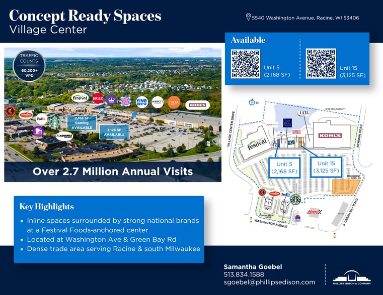 Anchored by Festival Foods, the #2 grocer in the Racine market. Strategically located at the high-traffic intersection of Washington Avenue and Green Bay Road, the center enjoys visibility to more than 60,200 vehicles per day. Village Center draws from a robust trade area with a population exceeding 82,100 within a three-mile radius. The center recorded over 2.7 million visits in the past 12 months (Placer.ai), making it a top retail hub in the region. A strong tenant mix including Kohl’s, Ulta, Five Below, Bath & Body Works, Panera Bread, and other national brands.