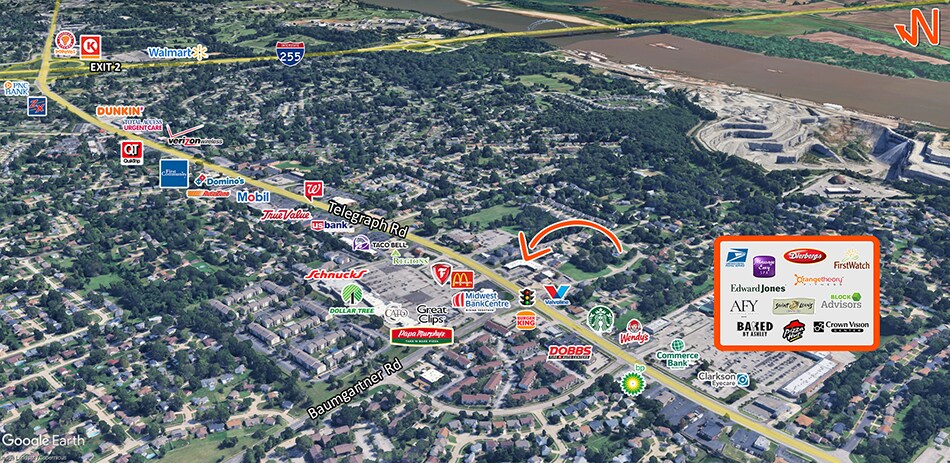 (2) Office/Retail Suites in Point South Center. Suites range from 1,100 – 1,852 contiguous SF. Suite 5534 is white boxed with 1 ADA restroom, a storage room and a open floorplan. (1,852 SF) Suite 5540 is available 7/1/25 and is currently being operated as a Vape Store. (1,100 SF) Located near the corner of Telegraph Rd and Baumgartner Rd. Plaza is next to the Circle-K Gas Station and across the street from Coppergate Square Plaza, Schnuck’s and Regions Bank.