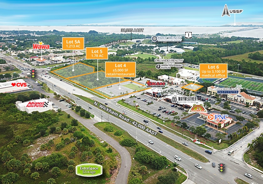 » Retail outlots for sale, ground lease, or build to suit: Lot 5: 1.78 AC | Lot 5A: 1.213 AC | Lot 6 (pad adjacent to Orlando Health): up to 3,100 SF medical office building » Pad available for ground lease or build to suit: Lot 4: ±5,000 SF for retail/restaurant building » Inline space: 2,491 SF » Combined traffic count of 80,395 vehicles per day » Adjacent to Holy Trinity Episcopal Academy, the most highly rated private high school in Brevard County » Located six miles north of the rapidly growing Eastern Florida State College, with an enrollment of more than 19,000 students » Co-tenancy with Orlando Health, PNC, Jeremiah’s Italian Ice, Mayweather Boxing + Fitness, and Salsas Cocina