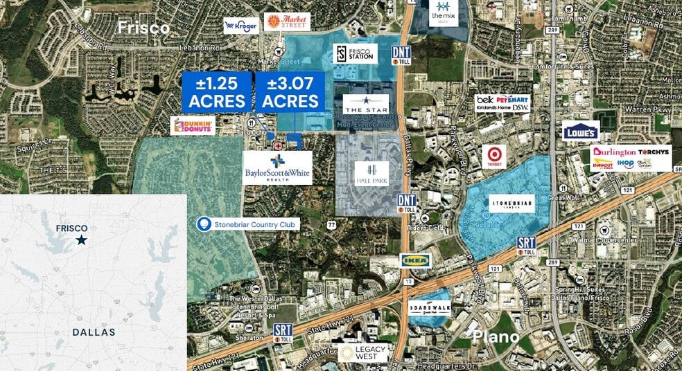 ±4.32 Acres Two parcels available. Retail/Commercial land site in Frisco, TX. Adjacent to Baylor Scott & White, steps from The Star. BC/PD-30 zoning, utilities on-site. Avg HH income $231K within 1 mi. 120K+ VPD on DNT.