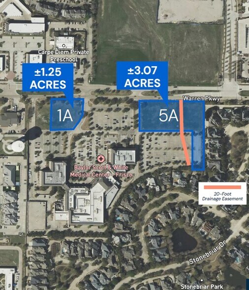 Rare retail and commercial land opportunity in the heart of one of the nation's fastest-growing and most affluent submarkets. Two shovel-ready parcels totaling ±4.32 acres are available individually or together, positioned directly adjacent to Baylor Scott & White Medical Center – Frisco and within walking distance of The Star, the Dallas Cowboys' 91-acre World Headquarters campus.