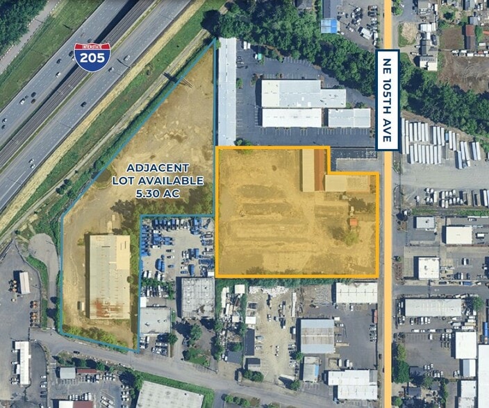 Prime, Flat, and Graveled Industrial Site with Warehouse ±2 Acre - ±4.22 Acre Yard (±14,911 SF of Warehouse Space) Call Brokers for Details • Great Visibility from I-205 with 2 Access Points from NE 105th Avenue • Ideally Located 1.2 miles from I-205, 2 miles from I-84, and 5 minutes to Portland International Airport (PDX).