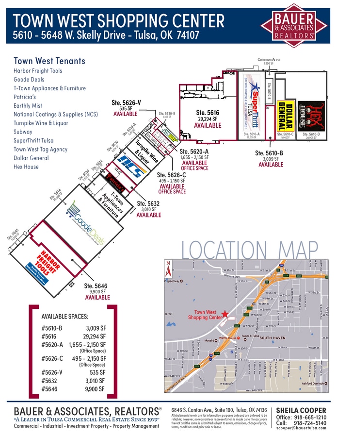 Town West Shopping Center (±158,735 SF) is a high-visibility retail destination with easy access from I-44 at W. 49th Street. The center captures strong daily traffic from Tulsa and surrounding communities and offers a competitive cost structure. A complementary tenant mix makes Town West well suited for both local and national retailers seeking visibility and convenience. Why Town West Shopping Center Works Capture the Commuter • Interstate visibility with immediate access from I-44 • Prominent signage opportunities and strong daily traffic counts • Visibility comparable to larger retail hubs—without the premium rent Serve the Workforce • Positioned in the heart of a dense employment corridor • Over 140,000 daytime workers within the trade area • Limited nearby food and service options create untapped demand for quick-service restaurants, convenience retail, and personal services Community Gateway • Diverse tenant mix serving daily needs • Ample parking supporting high-volume uses • Flexible space configurations that accommodate retail, office, medical, and light warehouse users Suites Available: 500 sf - 29,000 sf Two Outparcels Available! (2) 0.23 Acres For Lease/Sale *INCOG 2024