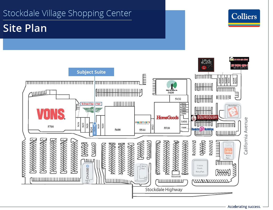 5620 Stockdale Hwy is a 1,120 square foot retail space available for sublease, located in the Stockdale Village shopping center. Adjacent tenants include Vons, Office Depot, Party City, Home Goods, and Dollar Tree