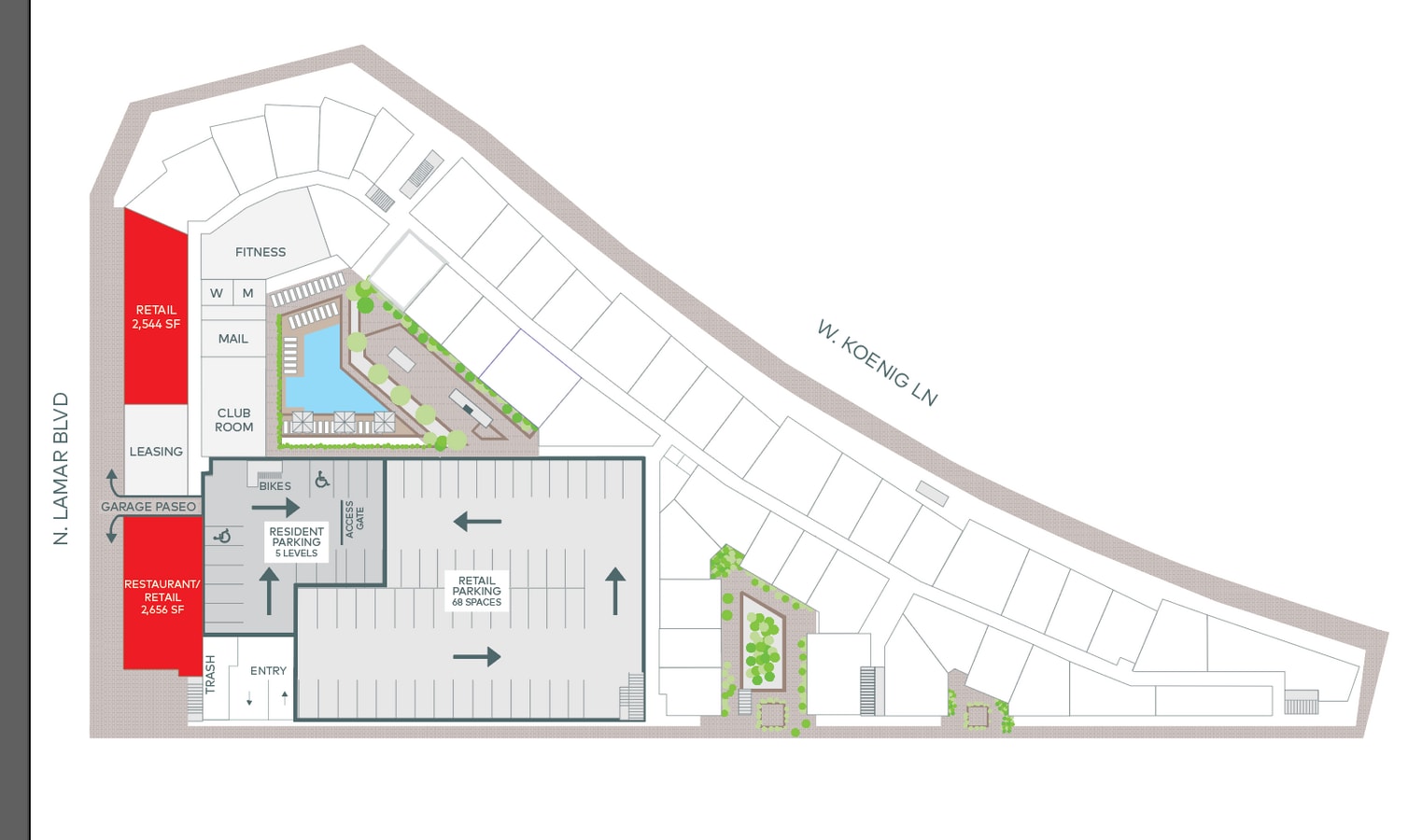 Sayers Real Estate Advisors is pleased to present the exclusive opportunity to lease a 2,656 square foot (SF) second generation retail space prominently located on N Lamar Blvd in Austin, Texas. Unit 100 is one of two commercial spaces totaling 5,200 SF under 279 luxury apartment units built in 2021. Located at the intersection of N Lamar Blvd and W Koenig Ln, the property boasts a strong north central Austin location just north of the University of Texas and The Triangle mixed-use community. Unit 100 was previously occupied by a grocery/market user and existing buildout/infrastructure (including a grease trap) is available for a new tenant to take advantage of. Additionally, the unit includes exterior patio space and signage opportunities along N Lamar. HotWorx, the neighboring retail tenant, has exclusivity on fitness use.