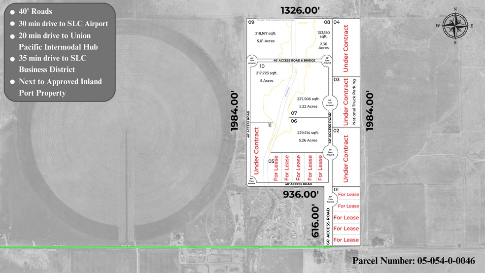 The is a prime location just 30 minutes from Salt Lake International Airport and three minutes off of I-80. The location is also adjacent to the newly approved Inland Port with rail access. The area is very suitable for all types of contractors, construction equipment, trucking and other "blue collar" type businesses needing secure space right outside of Salt Lake City. This area just off of I-80 is quickly becoming a concentrated assortment of all types of commercial and industrial businesses.