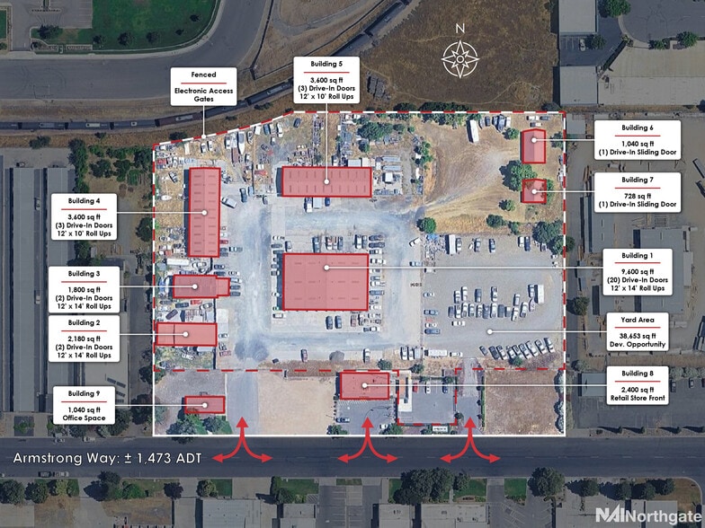 This flexible industrial property features a large, usable yard with multiple metal buildings suited for industrial, contractor, or service-oriented tenants. A small retail/office building fronts Armstrong Way, offering street presence and customer access.