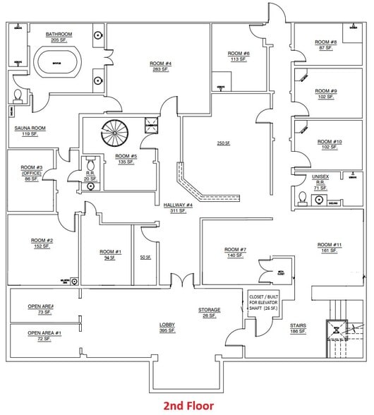 Originally constructed and operated as a professional office/spa environment, the first floor includes numerous private rooms, lobby/reception areas, and support spaces. The layout is particularly well suited for medical, wellness, aesthetic, therapy, or traditional office users requiring multiple treatment or consultation rooms.