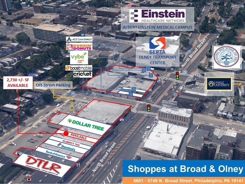 2,730 SF Available at 5725 N. Broad Street and near Dollar Tree. The Landlord’s existing tenant mix includes: Dollar Tree, Bank of America, Domino’s Pizza, DTLR, Dunkin’, ACE Cash Express, Liberty Tax, Affectionate Home Care. Cricket Wireless, Boost Mobile, Deli, nail salon, Chines-Style take-out, childcare and apparel. Additionally, work is underway for Vybe Urgent Care. The Broad & Olney Corridor of North Broad Street in Philadelphia, PA is across the street from the second busiest transportation hub in Philadelphia, the SEPTA Olney Transportation Center. Additionally, within a one-mile radius, over 35% of the workforce uses public transportation to commute to work and within that one-mile radius is a dense population of 56,028 and households in excess of 19,000. Major streets such as Old York Road, Stenton Avenue and Olney Avenue funnel to this area as well. Institutions around this market also support the customer base such as: The Einstein Medical Center, LaSalle University, The Philadelphia High School for Girls a/k/a “Girls High” and Central High School.