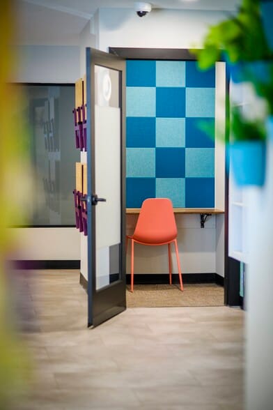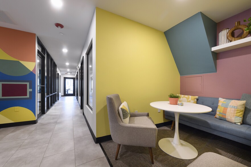 Private office with: •locking glass panel door •1 interior window •3 exterior windows •carpet flooring •motion sensor overhead light •adjustable window shades •adjustable height desk •adjustable height, rolling, ergonomic chair •locking file cabinet •trash can •OPTIONAL mailbox •OPTIONAL logo on door and community directory •OPTIONAL privacy film on interior window and/or door
