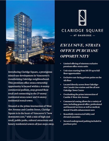 Claridge Square offers a premium strata office ownership opportunity within a landmark mixed-use development in Vancouver’s revitalized Oakridge neighbourhood. The project features nineteen exclusive office strata units situated in a 4-storey commercial podium above ground-floor retail, integrated with two residential towers. Units start at 501 SF and include options up to full-floor spaces, complemented by private patios on the 4th floor. Designed for flexibility, the commercial zoning accommodates general office, professional services, and medical uses. Delivery is scheduled for Q4 2025.