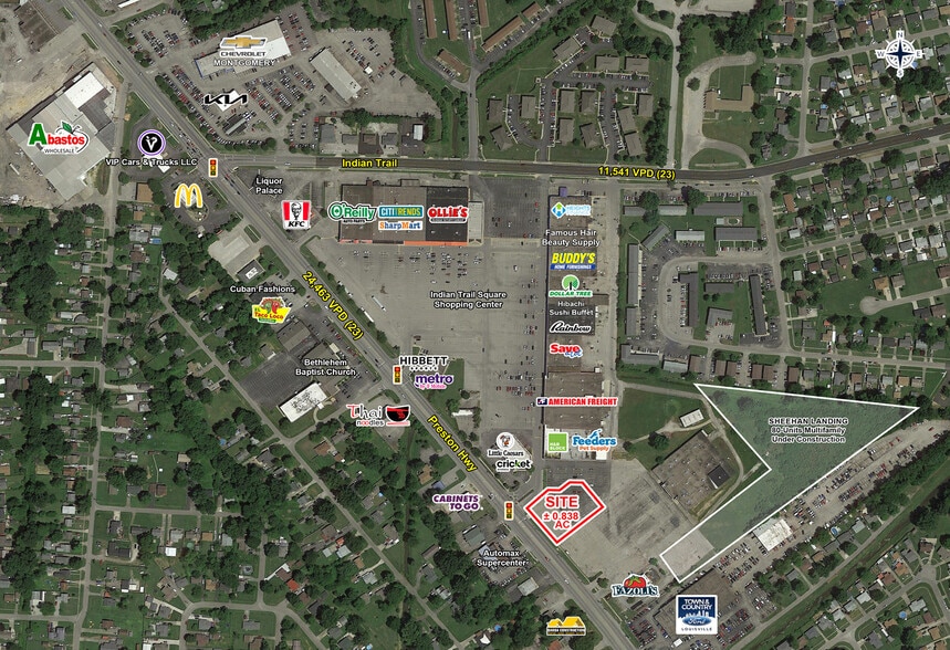 Available for Sale: ±0.838-acre corner outparcel facing Preston Highway with C-2 zoning. The site is located at the signalized entrance to Indian Trail Shopping Center, a well occupied center anchored by Feeders Pet Supply, American Freight, Hibbett Sports, Save A Lot, Dollar Tree, Ollie’s Bargain Outlet, and CitiTrends. Surrounding retailers include Sam’s Club, McDonald’s, Fazoli’s, Little Caesars, Cricket, Town & Country Ford and Montgomery Chevrolet. Over 24,000 vehicles per day (23) pass the site along Preston Hwy, a major Louisville commercial thoroughfare. The densely populated area is surrounded by Louisville’s major employers including UPS, Louisville International Airport, Ford Assembly Plant, and GE Appliance Park.