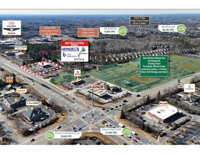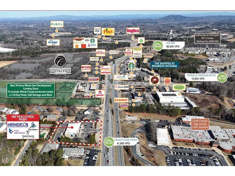 Peachtree Point is located along Peachtree Parkway (State Route 141) in Cumming, Georgia, one of the fastest-growing and most affluent suburbs in the Atlanta MSA. The property benefits from exceptional exposure along a primary north–south commuter corridor carrying approximately 41,800 vehicles per day, with immediate connectivity to GA-400, one of Metro Atlanta’s most heavily traveled arteries. The center features a tenant-favorable yet ownership-protective lease structure, with all tenants operating under NNN leases that provide full reimbursement of operating expenses, minimizing landlord expense exposure and enhancing NOI stability. This structure, combined with new construction and strong tenant credit, positions the asset as a low-maintenance, institutional-quality investment. The surrounding area is characterized by strong residential density, highly ranked schools, and ongoing mixed-use development. The property sits less than half a mile from The Collection at Forsyth, a dominant regional shopping destination featuring national retailers, restaurants, and entertainment options that drive consistent consumer traffic. Additional nearby development includes a planned 35-acre mixed-use project anchored by grocery, hospitality, and retail components, further strengthening long-term demand fundamentals.