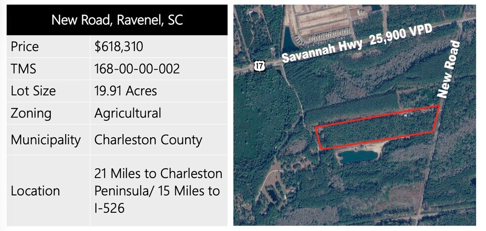 19.91 acres of land available off Hwy 17 in Charleston, SC Right off Savannah Hwy with over 29,900 Vehicle per Day 21 miles from downtown Charleston Opportunity to use for agricultural needs or to rezone for various purposes