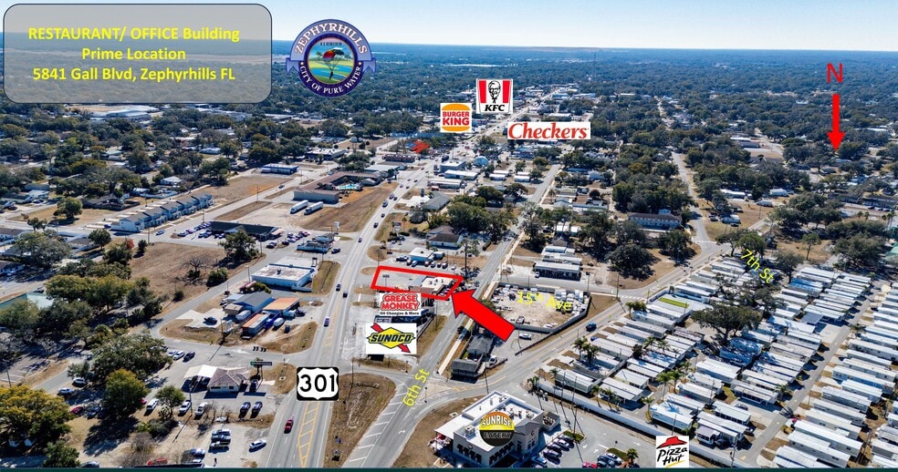 Positioned in the commercial core of Zephyrhills, this property offers a rare opportunity to acquire a highly visible freestanding restaurant property along busy US Highway 301. The 2,679 square foot building sits on a 0.23-acre corner parcel with frontage on three streets, providing exceptional access, circulation, and exposure to constant daily traffic.
