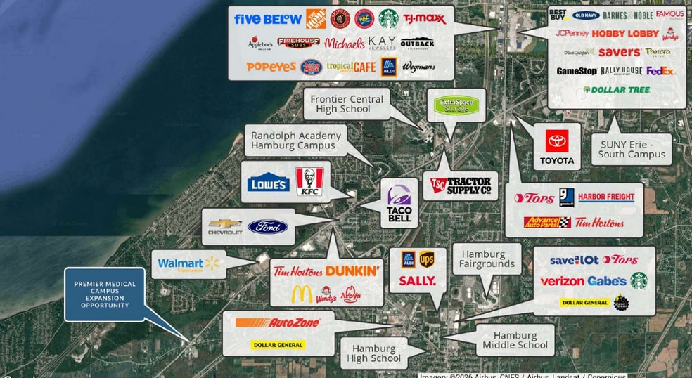 - High-visibility frontage along U.S. Route 20 (Southwestern Boulevard), a primary east-west artery serving Hamburg and Orchard Park.