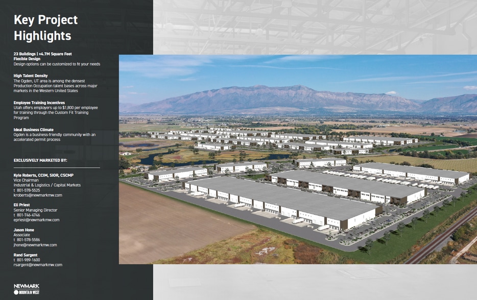 23 Buildings | ±4.7M Square Feet Flexible Design Design options can be customized to fit your needs High Talent Density The Ogden, UT area is among the densest Production Occupation talent bases across major markets in the Western United States Employee Training Incentives Utah offers employers up to $1,800 per employee for training through the Custom Fit TrainingProgram Ideal Business Climate Ogden is a business-friendly community with an accelerated permit process