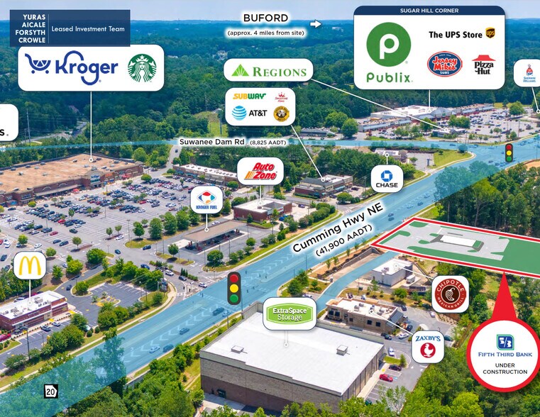 High-visibility and easily accessible location along State Route 20, Sugar Hill’s primary retail thoroughfare (41,900 AADT). Fifth Third Bank saw growth in key areas in 2024, including strong household and Southeast regional deposit growth, 17% growth in Wealth and Asset Management, and 30% year-over-year revenue growth in its Newline commercial payments platform. The five-mile radius serves an affluent and populous region of 141,196, with an average annual household income of $173,748 within one mile. Built in 2026, the 2,220 SF property is designed for Fifth Third Bank’s specific operational needs. Absolute NNN lease structure transfers maintenance and expense obligations to tenant, including roof, structure, and parking lot. Projected population and income increases within 1-, 3-, and 5-mile radii over the next five years poise this Fifth Third Bank and Sugar Hill for steady concurrent growth.