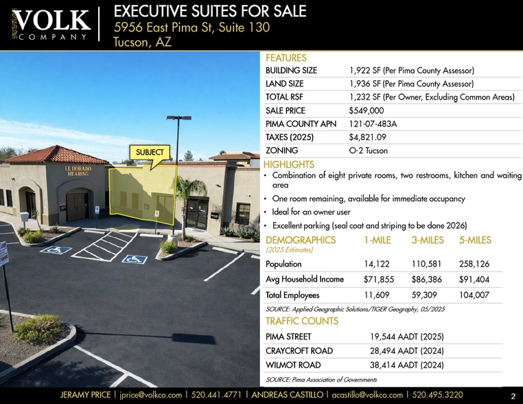 Suite 130: Executive Suites for Sale, Tucson 5956 E Pima St 1,232 SF 87% Leased Office Building Tucson, AZ 85712 $753,766 CAD ($611.82 CAD/SF) 5.89% Cap Rate