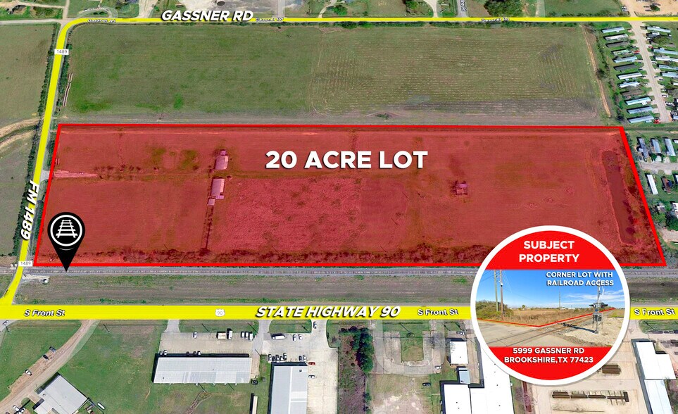 • Land Lot of approximately 20 Acres located in Brookshire, Texas just a short distance from the big city of Katy. • Easy access to I-10 Katy Freeway, State Highway 90 and FM 1489. • Corner lot with rail access. Brookshire Police Department is right across from the lot. • Double street visibility of 507 Feet of frontage on FM 1489 and 1653 Feet of Frontage on Highway 90/ S. Front St. • Unrestricted lot, ideal investment lot for any industrial manufacturer. There are many industrial businesses nearby. • Location is an Opportunity Zone area. • Within Brookshire ETJ and Brookshire Municipal Water District • Potential rail access