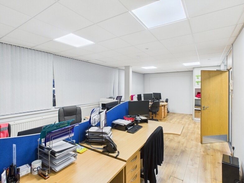 The subjects comprise a standalone industrial premises of steel portal frame construction, benefitting from a dedicated pedestrian and vehicular access via Glenfield Road. Internally, the premises is currently fit out in accordance with the existing occupier's use. To the front, there is a ground floor showroom with office accommodation situated at first-floor level. The office has recently been refurbished and now benefits from carpeted flooring and a suspended tiled ceiling incorporating LED lighting throughout. The warehouse is located to the rear of the property and comprises solid concrete flooring, supplemented by a combination of translucent roof panels and LED lighting. The unit provides an eaves height of approximately 3.34m and is served by multiple electric roller shutter doors to both the front and rear elevations. A mezzanine level also offers additional storage capacity. The premises further benefit from a large secure yard, accessed via a shared road between the subjects and the neighbouring property. The yard is secured by steel fencing and accessed through secure steel gates. In addition, there is car parking to the front of the property, suitable for both staff and customers.