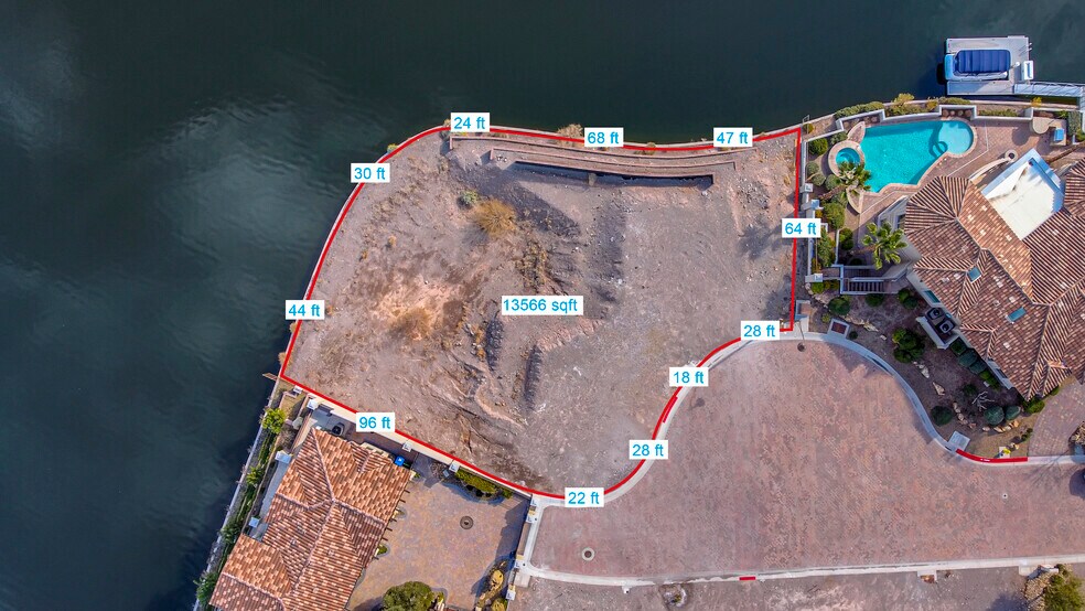 Large premium Lake front lot with 213 feet of shoreline on the tip of the peninsula. The lot has private dock potential and cul-de-sac privacy. Ground level panoramic view of Lake Las Vegas.