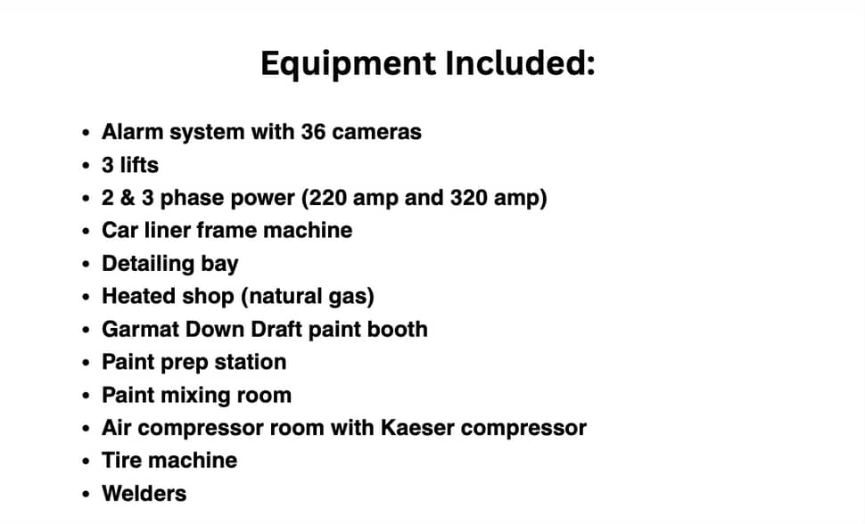 Inside, you will find a newly renovated office with heated floors, overlooking a spacious heated main shop powered by natural gas. The shop is fully equipped with 14 large drive-in overhead doors, 3 car lifts, welders, a car liner frame machine, detailing bay, Garmat Down Draft paint booth, paint prep station, paint mixing room, and an air compressor room with a Kaeser compressor. Additional features include a shop restroom, tire machine, and a storage and lunch room with direct views of the shop floor. Power capacity includes both 2 & 3 phase service (220 amp and 320 amp), supporting heavy duty operations. The building sits on a strong foundation capable of supporting 2-3 floors offering future vertical expansion potential. Conveniently located near major highways, the river front and community institutions, this property is a rare find for owner users or investors seeking a turnkey facility.