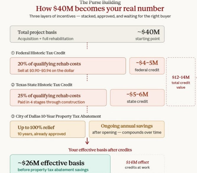 Redevelopment is approved for 45% total historic tax credits — 20% Federal and 25% Texas State — substantially reducing project costs while preserving the building’s legacy.