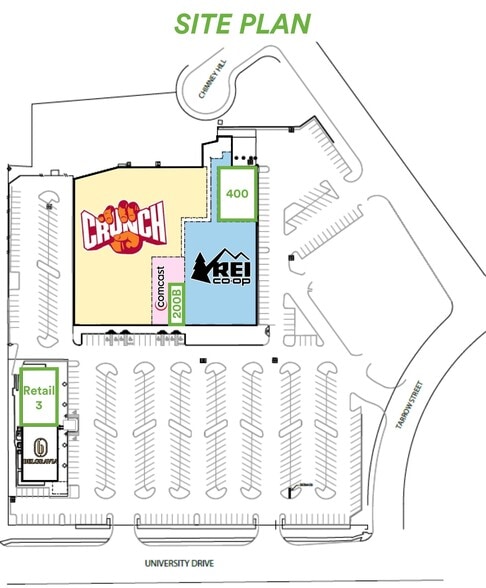 - Prominent hard corner location on University Drive and Tarrow Street with excellent visibility and exposure to over 35,000 cars per day