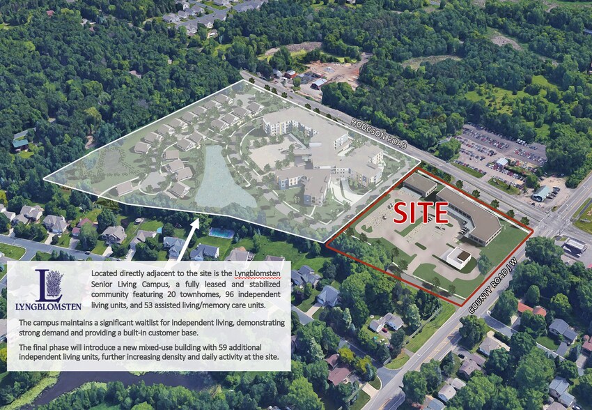 Property Summary: The Final Phase at Lyngblomsten – Lino Lakes Location: Intersection of Hodgson Road and County Road J (Ash Street), Lino Lakes, MN. Be part of the final development phase at the prestigious Lyngblomsten Senior Living Campus. This upcoming mixed-use project is set to break ground in Fall 2026, offering approximately 20,000 square feet of premier retail and service space on the ground floor of a new 59-unit independent living building. The site offers a rare, built-in customer base, situated directly adjacent to a fully leased senior living community featuring nearly 170 existing units across townhomes, independent, and assisted living. The development features upscale construction and an incredible 6:1,000 parking ratio, ensuring easy access for both campus residents and the surrounding Lino Lakes community. Current availability includes five flexible retail bays (1,484 SF each, combinable), a large end-cap earmarked for a daycare with an outdoor play area, and a 4,210 SF premier restaurant end-cap complete with a dedicated outdoor patio. Recent roadway infrastructure improvements, including a new roundabout at Hodgson Road and County Road J, provide streamlined access and high visibility to this burgeoning trade area.