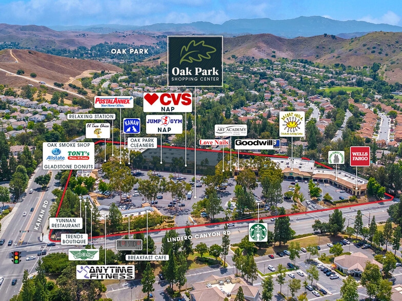 Oak Park Shopping Center offers a diverse mix of retail tenants in service, medical, lifestyle, and convenience sectors, catering to Oak Park’s upscale community of nearly 50,000 residents and household incomes averaging $180,000 annually within a 3-mile radius. Located at the busy, signalized intersection of Kanan Road and Lindero Canyon Road (30,000+ VPD), the center boasts prime real estate fundamentals, situated across the street from a Pavilions-anchored shopping center (SWC) and just under 2.5 miles north of the 101 Freeway.