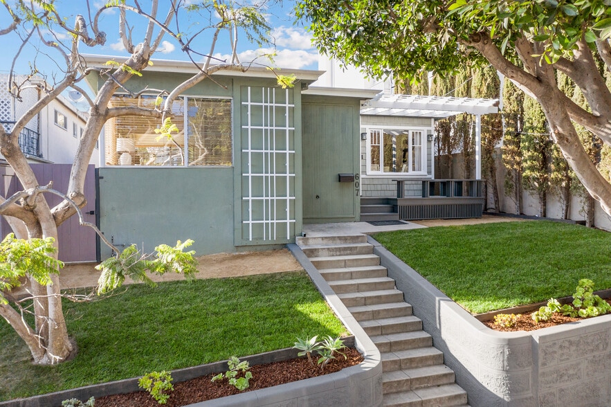(LAST SALE PRICE NOT ACCURATE) Duplex + Office/Studio - Charming Craftsman-style duplex at 607 Ashland Ave, perched above a quiet, tree-lined street in Santa Monica’s highly desirable Ocean Park neighborhood, just four blocks to Main Street and six blocks to the beach. Both units feature private, separate entrances and are filled with natural light, offering hardwood floors, recessed lighting, skylights, and a newly constructed dog run along the side of the home. The 1-bedroom, 1-bath front unit includes an open kitchen, Dutch door, and a classic Craftsman front deck with built-in bench seating, ideal for al fresco dining. The 2-bedroom, 1-bath rear unit boasts a spacious open kitchen, vaulted ceilings, private front and rear gated entrances, and an expansive exclusive-use fenced courtyard designed for indoor-outdoor entertaining. A detached studio with high vaulted ceilings and an oversized skylight provides flexible use as a home office, fitness or yoga studio, or bonus space. This unique property offers exceptional flexibility and value, ideal for an owner-user, an income-producing duplex at strong current market rents, or potential reconfiguration into a single-family residence. Studio not included in total square footage.