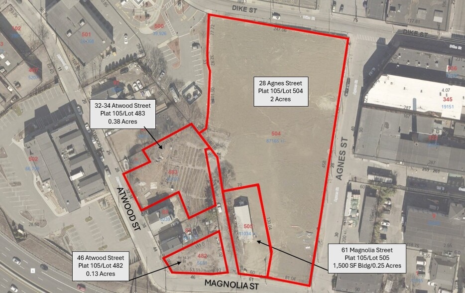 This 2.76-acre property is comprised of four (4) parcels: Plat 105 /Lot 482 (46 Atwood St), Lot 483 (32-34 Atwood Str), Lot 504 (28 Agnes St), and Lot 505 (61 Magnolia St). A 1,500 SF metal flex building is located on the 61 Magnolia St lot.