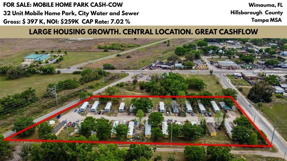 If you're looking for a simple, easy-to-run CASH COW, look no further. This is a unique opportunity to take the money to the bank and collect. Located in Wimauma, Florida, in Hillsborough County within the thriving Tampa MSA, this 32-unit mobile home park features a mix of long-term mobile units and weekly room rentals, providing consistent income. The property also includes a full laundry facility and an additional RV campsite with hook-up for added rental income.