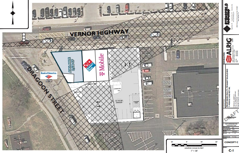 Recently developed multi-tenant retail center located on the southwest corner of Vernor Highway and Dragoon Street at a signalized intersection, in southwest Detroit.