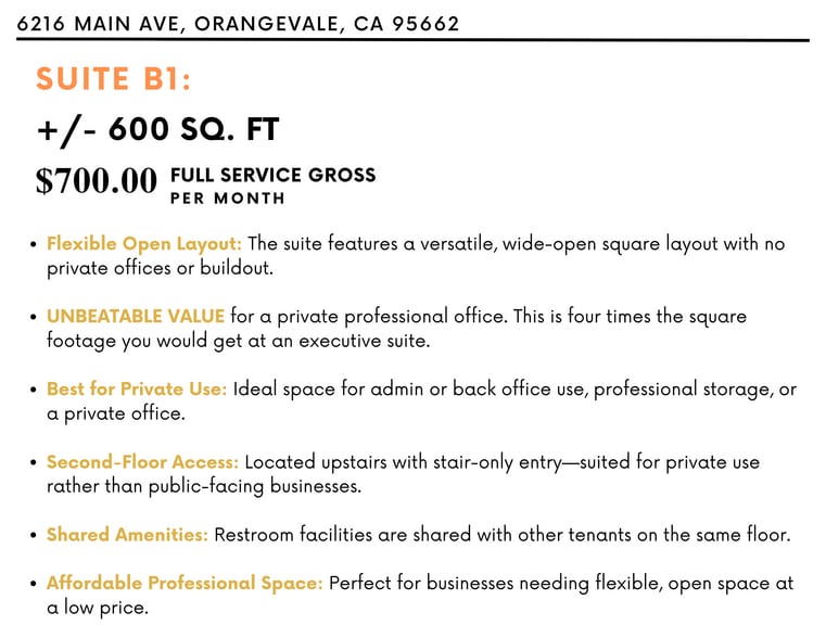 Affordable and flexible office space in the heart of Orangevale. This ±600 SF suite sits on the second floor of The Main Business Park, offering excellent visibility along Main Avenue and quick access to Greenback Lane, Folsom, and nearby amenities. The wide-open layout provides versatility for back office operations, administrative use, or professional storage. With a full-service lease at just $700/month, this space delivers unmatched value for businesses seeking private space at a competitive rate.