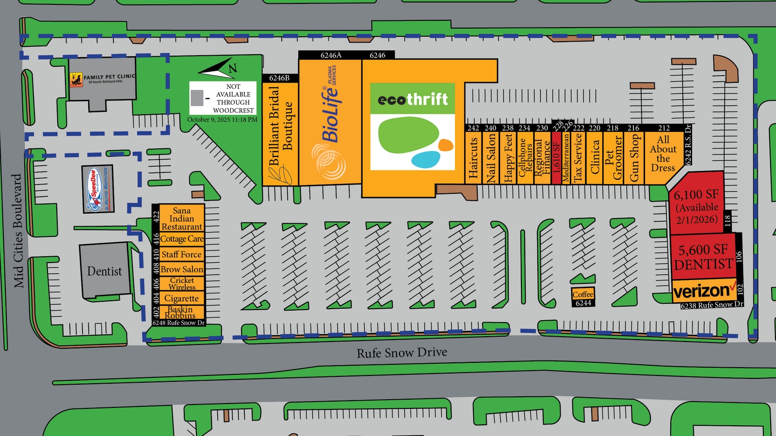 Harness the tremendous market exposure and accessibility of Rufe Snow Village and become a prominent destination on North Richland Hills’ primary retail corridor. Eco Thrift is the newly-opened anchor! The only two current availabilities are a newly built out 5,600 SF Dentistry -- intended to be a Brident Dental -- and a 1,610 SF partial office build-out. Coming available in early 2026 will be a 6,100 SF Retail suite. If these are not the perfect fit, Woodcrest Capital also has limited spaces available opposite the intersection at Watauga Marketplace as well. Tenants will be joining a diverse spectrum of businesses at Rufe Snow Village, and it shares the intersection with synergetic neighbors, such as Albertsons, CVS, CrossFit, Dollar Tree, Big Lots, Gamestop, Rent-A-Center, and several restaurants. Located in a suburbanized zone just over a mile from Interstate 820, this center is not only accessible for the wealthy residents of North Richland Hills, but it is also a convenient destination for thousands more throughout DFW. There are high-end destinations like Iron Horse Golf Club and Diamond Oaks Country Club a few minutes away, and the approximately 108,000 households within a 5-mile radius report an average income of $103,343 per year and combined annual spending of $3.8 billion. Woodcrest Capital welcomes first-time and franchise businesses to its centers with easy-to-read leases and flexible terms while being sufficiently sophisticated to please the largest national credit tenants. As a family-owned business with over 40 years in commercial real estate, Woodcrest owns and operates everything from Class A centers in the busiest neighborhoods to troubled centers it’s rehabilitating in struggling rural communities. Give Woodcrest Capital a call today to find the right location for your business, as Woodcrest usually has multiple retail opportunities in the immediate area.