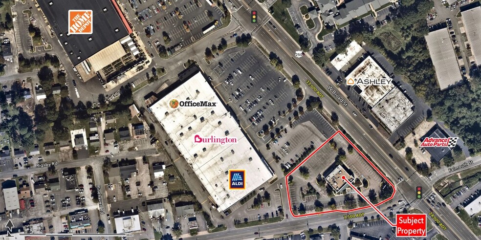 The property is strategically located across from Ashley Furniture and adjacent to Home Depot, benefiting from high visibility and significant foot traffic. It shares a traffic light with multiple entrances, ensuring easy access, and offers ample parking with 122 spaces. The property enjoys a strong traffic count of 30,000 ADT on West Broad Street. With robust local demographics—9,887 residents within 1 mile, 86,825 within 3 miles, and 255,872 within 5 miles—alongside median household incomes of $83,901, $87,662, and $80,992 respectively, this site presents a prime opportunity for high-visibility retail or service-oriented businesses.