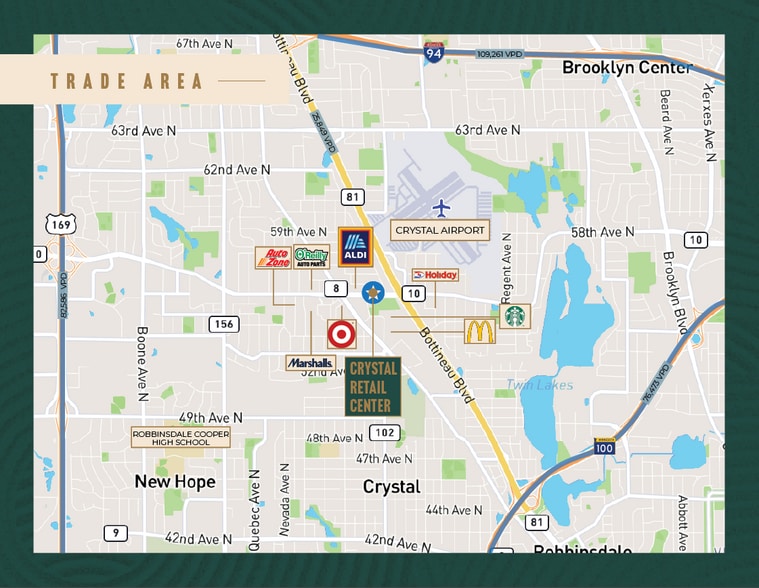 - DENSE RETAIL CORRIDOR - The offering is located in a dense retail corridor in the first ring suburb Crystal.