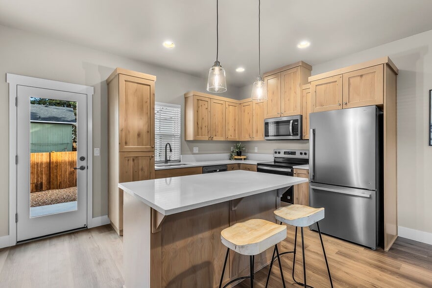 - Quartz countertops, stainless steel appliances, waterproof plank flooring, hand-textured walls, cement lap siding