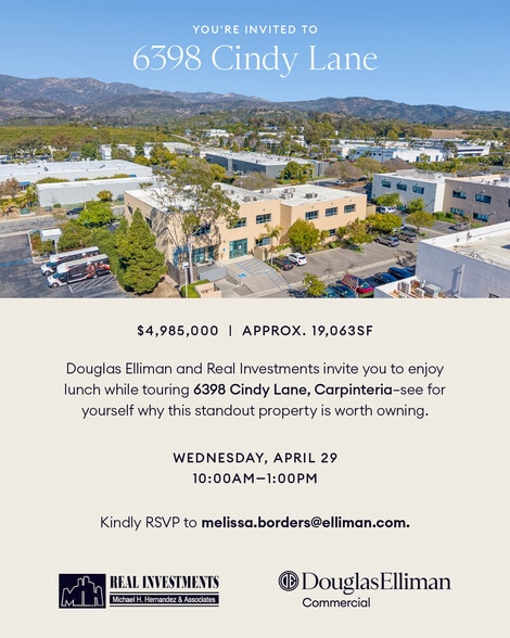 The Carpinteria Business Park at 6398 Cindy Lane embodies the town’s unique blend of coastal charm and professional enterprise, offering a scenic yet functional workspace. Located near the Pacific Ocean, this approx. 19,063-square-foot building provides breathtaking ocean and mountain views, creating an inspiring environment for businesses. The property features ample on-site parking with approx. 57 spaces, ensuring convenience for employees and visitors. The surrounding area offers a vibrant mix of dining options, retail shops, and recreational facilities, fostering an excellent work-life balance. Carpinteria’s commitment to sustainability is evident in its pedestrian-friendly streets and extensive bike lanes, encouraging eco-friendly commuting. Additionally, the building is easily accessible via major highways and public transportation, making it an ideal location for businesses seeking both professional efficiency and a relaxed coastal atmosphere. Exchange Opportunity – Sellers are open to considering exchanges for real property of equal or greater value located in Ventura or Santa Barbara County. Acceptable property types include residential, commercial, industrial, income-producing, or vacant land. All relevant and qualified exchange proposals are welcome for consideration.