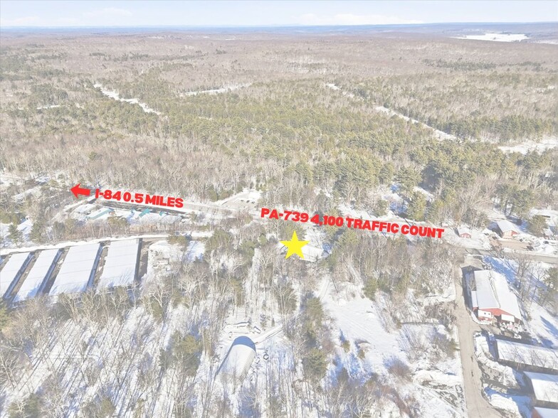 Versatile Commercial Opportunity on 2.11 Acres – Prime I-84 Access. The main building is nearly 2,500 square feet of flexible office and commercial space, ideally located just 0.5 miles from Exit 34 on I-84 and 0.5 miles from the main entrance of Hemlock Farms, a community of over 3,000 homes. This strategic high traffic count location (4,100 cars daily) offers excellent accessibility and exposure, with multiple additional large residential communities within a 15-minute radius. The main building features a functional layout including multiple private offices, a reception area, conference rooms, showroom space, ample storage, and a small commercial kitchen—making it well suited for professional offices, service businesses, medical, contractors, or showroom-based operations. Complementing the property are two separate garages providing valuable additional utility: one measuring approximately 519 square feet with a loading dock, 12’ ceilings and 8’x8’ garage door and the other 1,553 square feet with 16’ ceilings and 12x’12x door, ideal for equipment storage, vehicles, or operational workspace. Current owner is installing a new HVAC system prior to closing. The property is currently occupied by a building company that is relocating locally, presenting a turnkey opportunity for the next owner. With generous acreage, strong proximity to major roadways, and access to a substantial residential base, this property offers outstanding potential for a wide range of commercial uses.