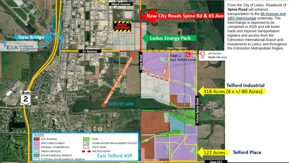 The subject land is just over 3 km from the Edmonton International Airport and is the first developable site within the East Telford Lake Area Structure Plan. A new road, 65th Avenue, is now completed within 800 metres of the property, and key infrastructure, including a sanitary trunk line, is expected to be just as close. The Alberta government is investing $116 million in a new bridge along 65th Avenue, set to open in 2025, which will connect the Telford lands, Highway 2, and the airport. The Edmonton International Airport, with $100 million in federal funding received in 2022, is developing a major logistics and e-commerce hub with plans for 60 million square feet of warehouses. Shipping from Shanghai to Prince Rupert takes 12 days and is $400–$500 USD cheaper than U.S. ports. From there, goods reach the EIA by rail in just 2.5 days. With ongoing terminal expansions, Prince Rupert and EIA form one of the fastest and most cost-effective distribution networks in North America. S & D holds approximately 750 acres of future industrial and 500 acres of future residential land near the EIA.