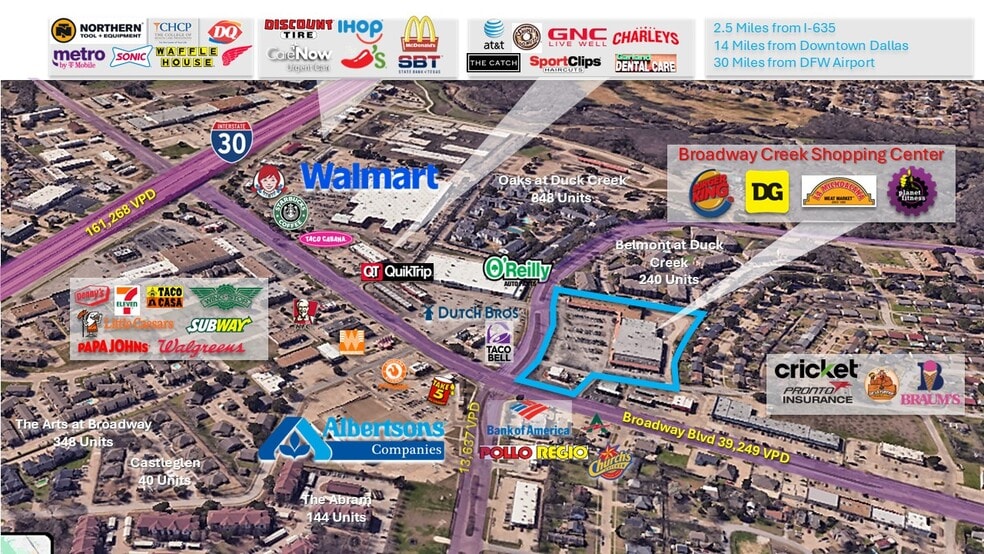 The property is positioned along one of the busiest retail corridors in southeast Garland and benefits from excellent visibility and strong traffic generators, including a