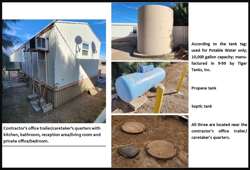 - Equipped with water well, propane, septic, and two large storage tanks.